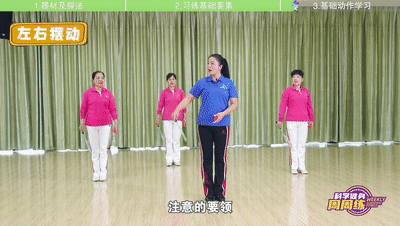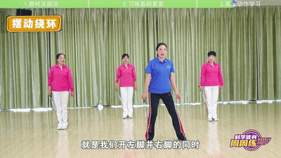(2)摆动环绕是在左右摆动动作基础上,加上步伐的训练。在开左脚并右脚的同时,脚有一个提踵,然后再开左脚。在并步走时,手上的动作就不是左右摆动了,必须要把这个环绕完,即在体前画完顺时针或者逆时针的一个圆时,拍尖还应该是冲向前方。
