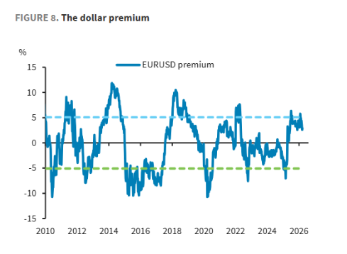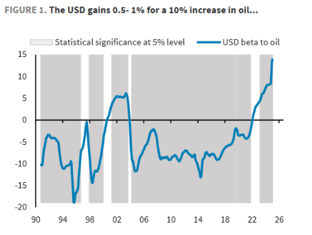 巴克莱银行论说指出,中东步地升级触发的动力价钱冲击诚然提振了好意思元,但好意思元相干于利率互异基准的抓续过期标明,约5%的"好意思元风险溢价"已树大根深、难以散失。一朝异日几个月中东步地趋于健硕,动力价钱回落,好意思元将濒临弗成幸免的短期疲软。