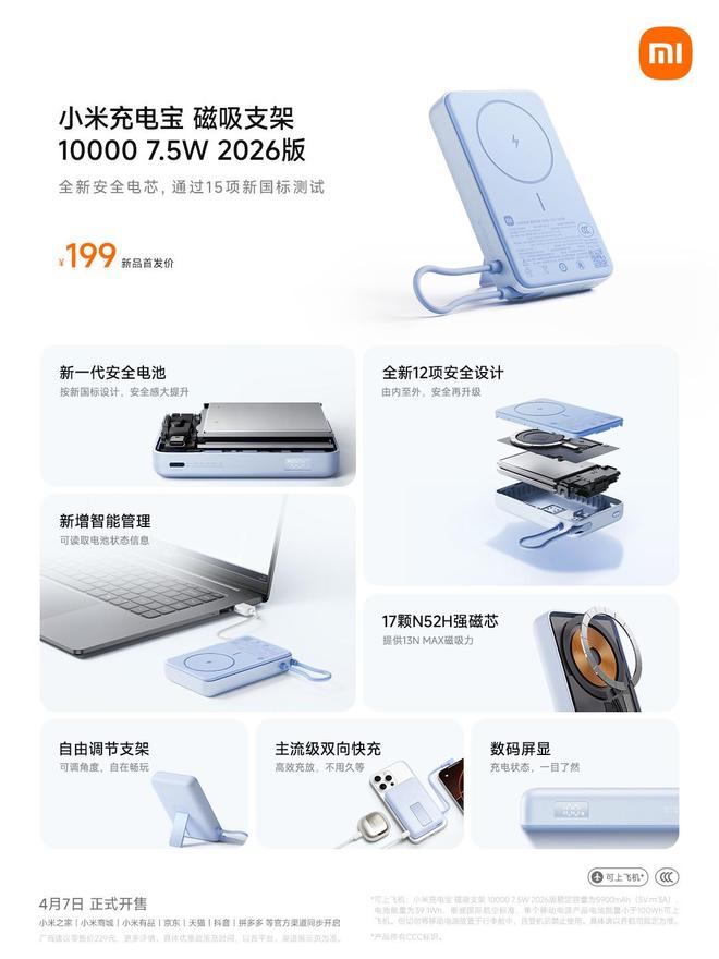 IT之家 4 月 8 日音书,小米首款知足最新国方向充电宝本日认真发布,小米充电宝磁吸支架 10000 7.5W 2026 版现已开售,首发价 199 元。(点此购买)
