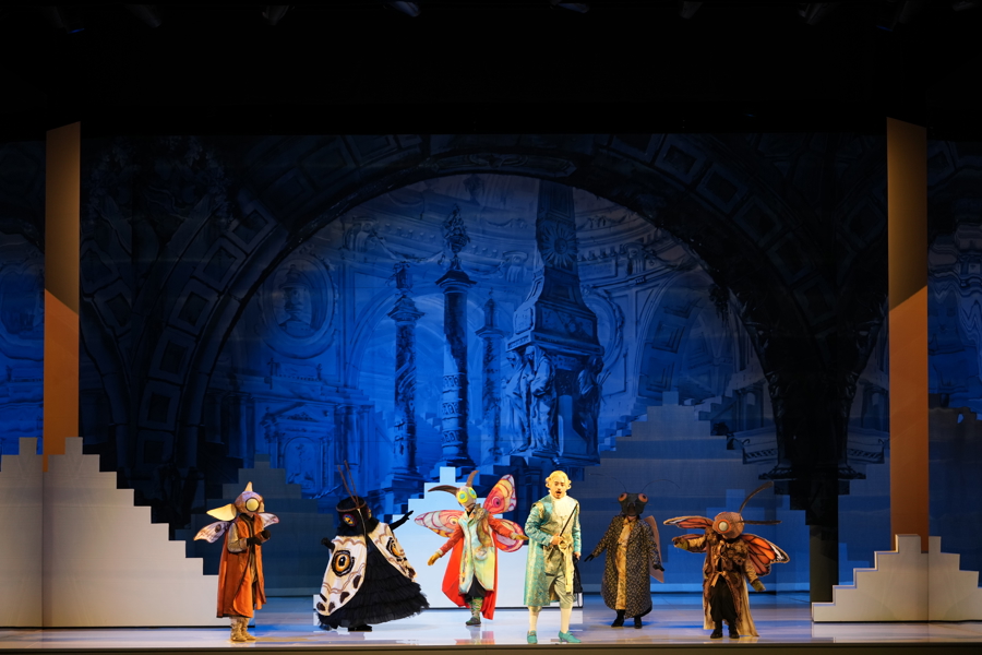 舞台上,蓝白色为主基调,星盘、圆月、古典开辟纹样充满童话感。帕帕盖诺出场时,明快的暖光切换,蓝金相间的支撑戏服与灵动的排笛相映,贩子烟火气扑面而来。夜后则着银白色蓬蓬征服裙登场,与圆蟾光门、星图穹顶相互照映,如蟾光流泻,尽显变装的广大与威严。