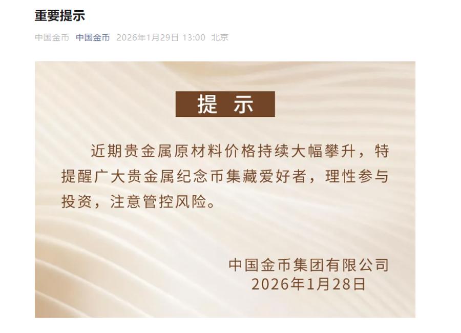 1月29日,中国金币集团发布公告,近期贵金属原材料价格持续大幅攀升,特提醒广大贵金属纪念币集藏爱好者,理性参与投资,注意管控风险。