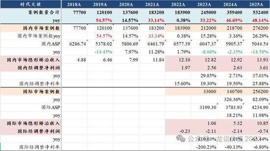 期间天神25年国外案例数如故接近国内水平,达到25.6万例、同比增长82%,公司征战26年国内案例数增长18%到33万例傍边,国外案例数增长33%至34万例傍边,公司布局国外3年时辰,2026年将完了国外案例数和隐形矫治收入反超国内,期间天神的总收入增速从2022年的-0.16%被国外业务拉动到2024-2025年折柳增长31%和35%。