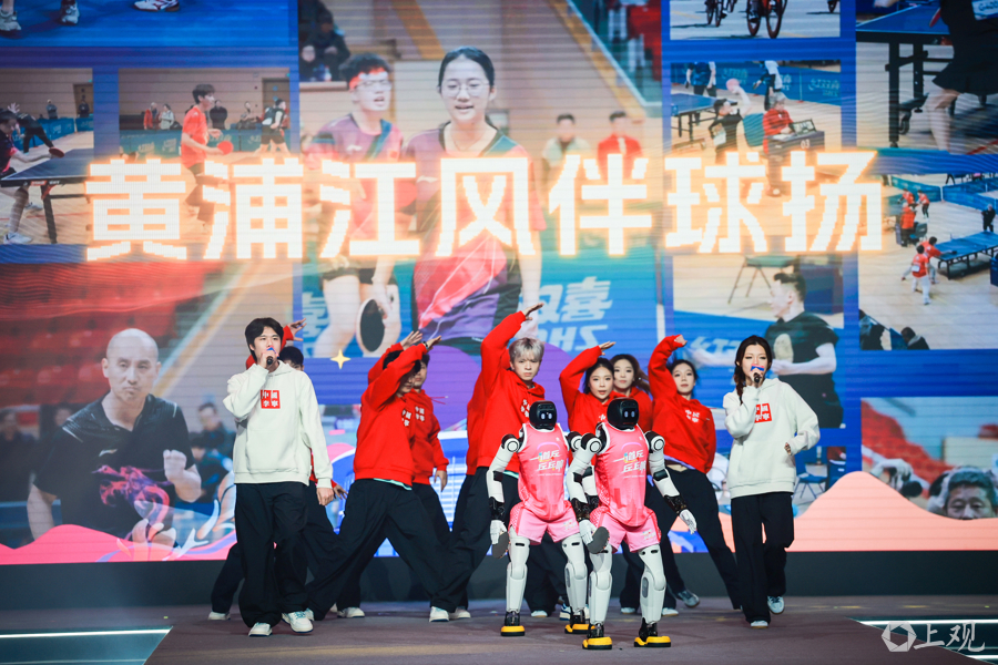 开幕式上,开场秀《一齐乒 乓乓响》舞者与机器东谈主共舞,以节拍韵律传递乒乓怜惜。