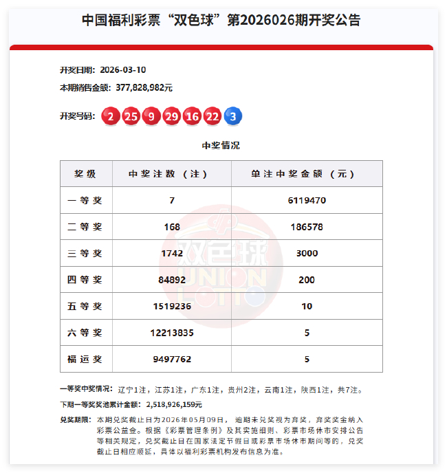 北京时分2026年3月10日,福彩双色球第26026期开奖,当期开奖号码为红球02 09 16 22 25 29,蓝球03。本期一等奖开出7注,单注奖金611万元;二等奖开168注,单注奖金18.6万。此外,因开奖前奖池高于15亿,增设5元福运奖(射中3枚红球即中奖),共开出9497762注。本期双色球销量为3.77亿余元,奖池余额25.18亿余元。