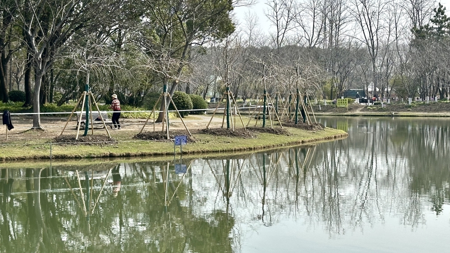 在樱花岛河边,70多株垂枝樱的枝条上已长出了大大的花苞,预测再过一两周将插足花期。